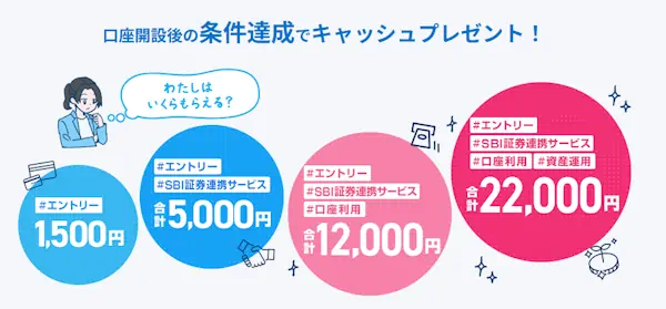 2025年9月1日〜12月30日の期間中に新規口座を開設すると、以下の条件達成で最大22,000円がもらえます。