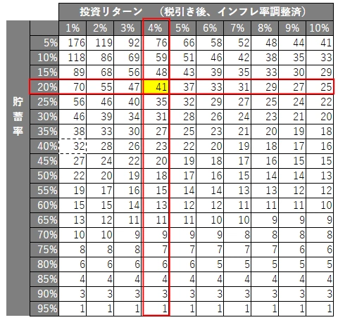上の表は、貯蓄率と投資リターンから、FIRE達成(1年の生活費の25倍が貯蓄できる状態)までにかかる年数を求める表となります。