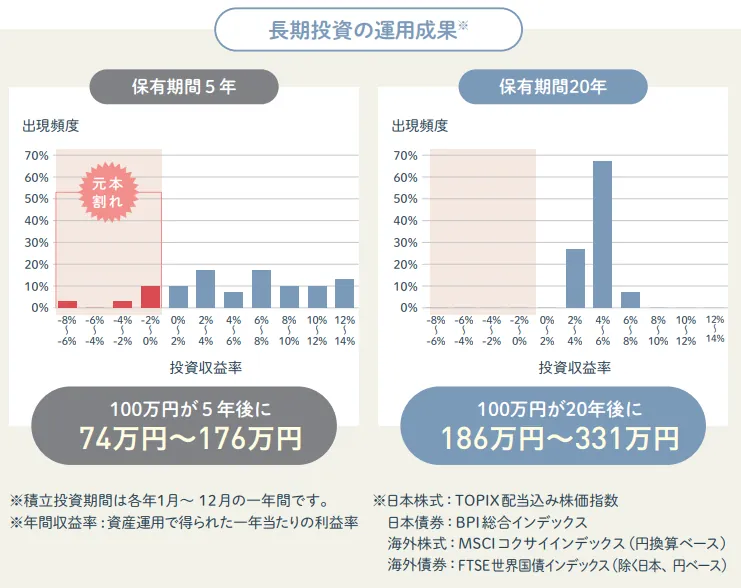 金融庁のグラフの左側(5年保有)に「元本割れ」のゾーンがあったことを見逃してはいけません。最終的に資産が増えるとはいえ、投資を始めた最初の数年は「元本割れ」という地獄に耐えなければならない局面もあります。