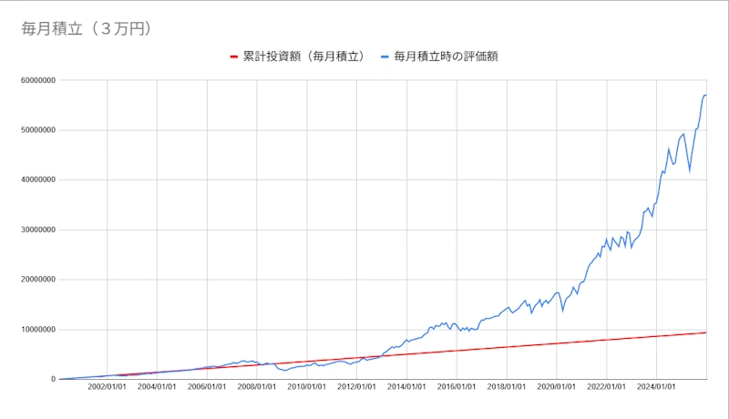 - 毎月積立: 月末に一定額を投資(月3万円)