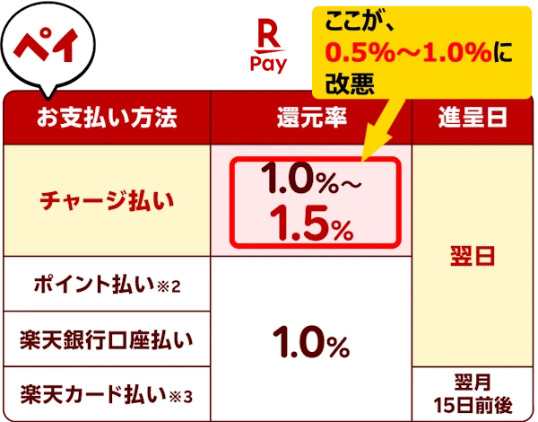 - チャージ(1.5%)+ 楽天ペイ利用(1.0%)= 合計 2.5%還元
